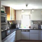 Küche mit Schichtstoff belegt in grau. Kombiniert mit Buche-Echtholz